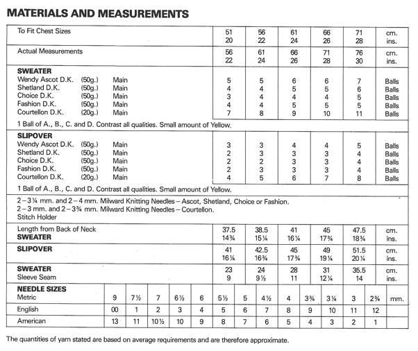 Pattern from 1986 Wendy (Designed by Joy Gammon). To make 5 sizes from 20-28" chest