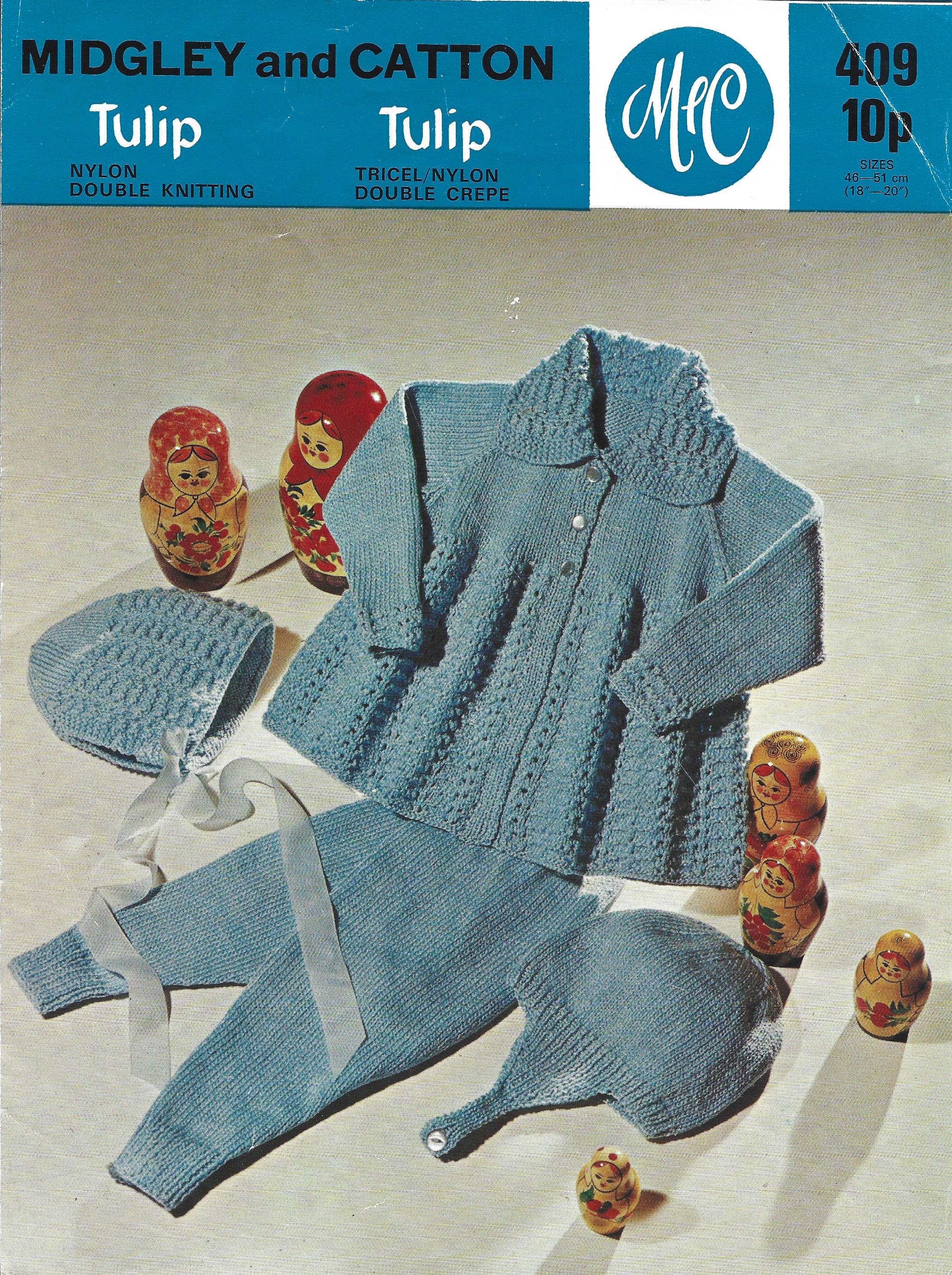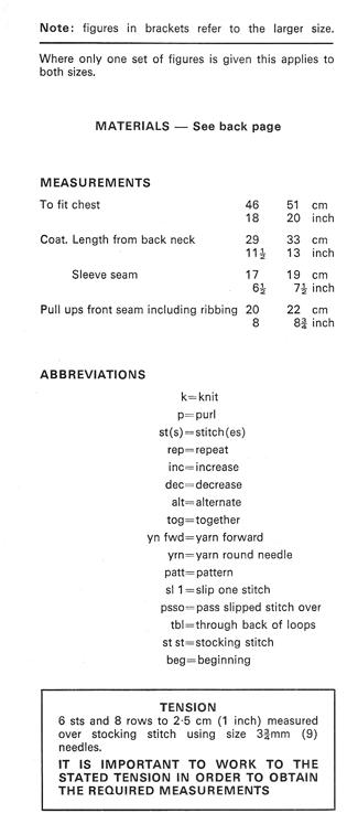 Knitting pattern to make a cardigan/coat, a bonnet/ear muff hat and matching leggings to fit chest 18-20"