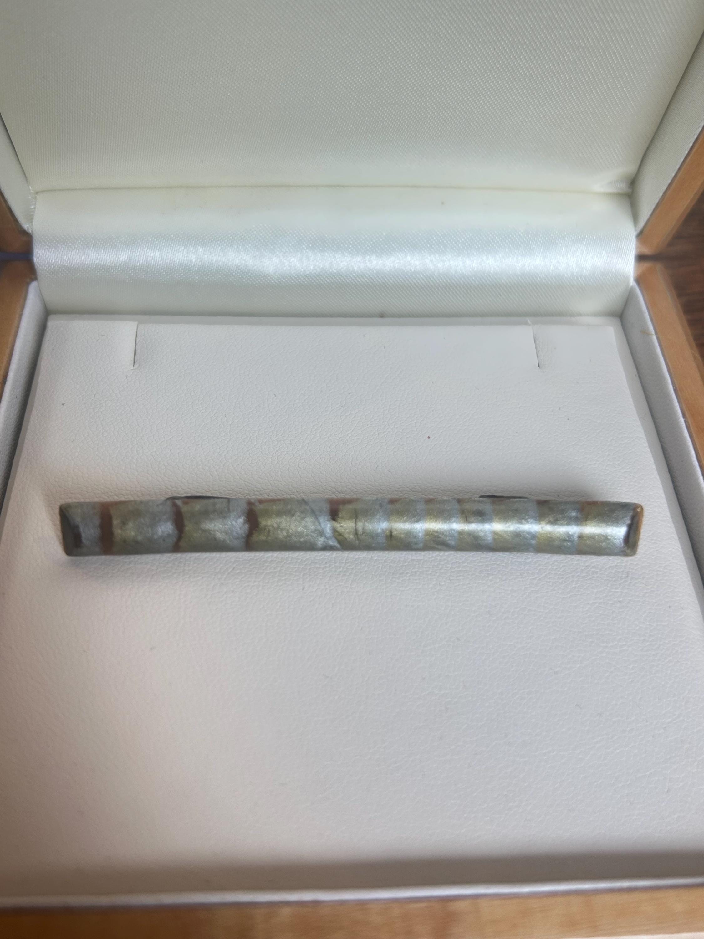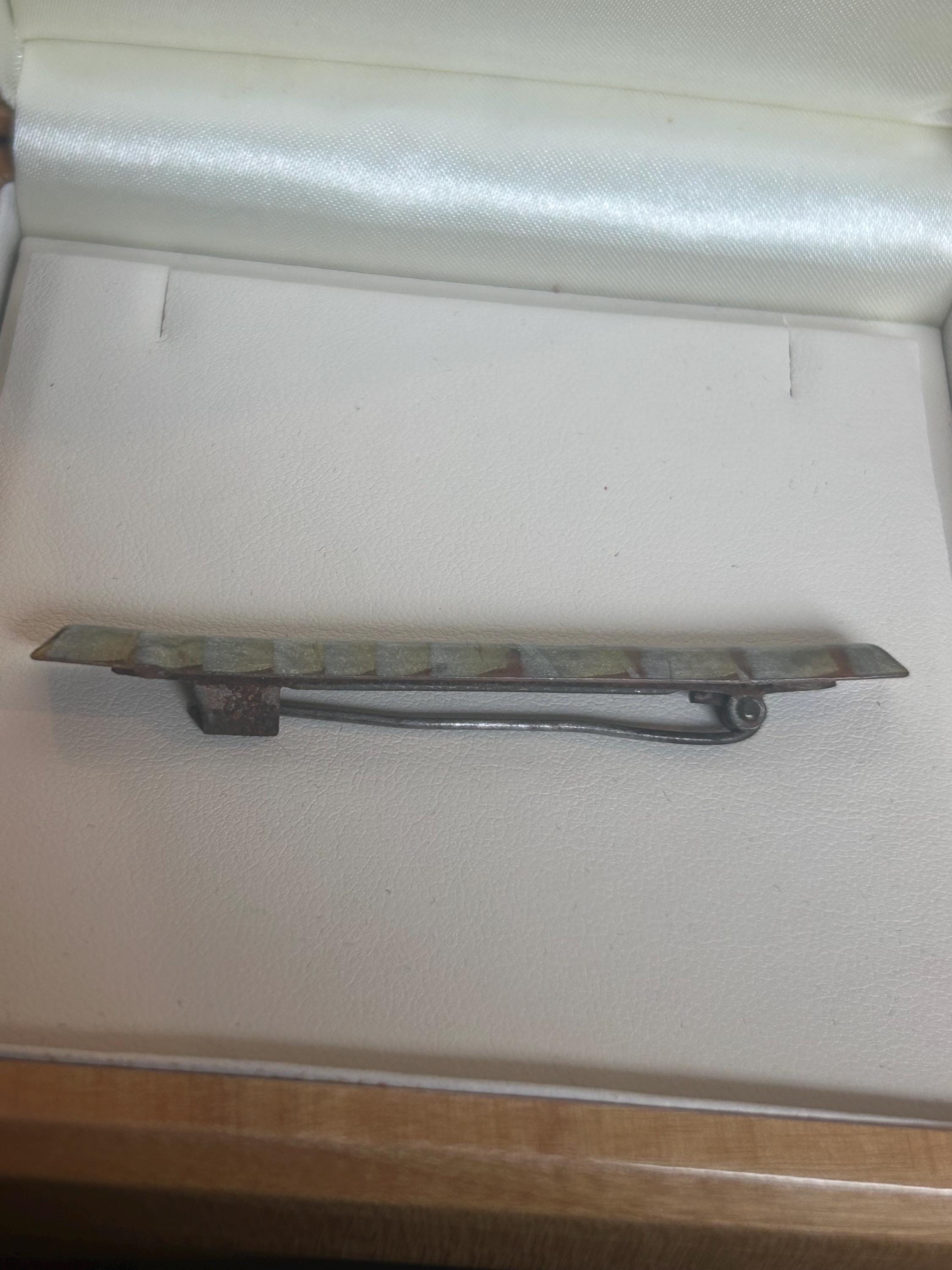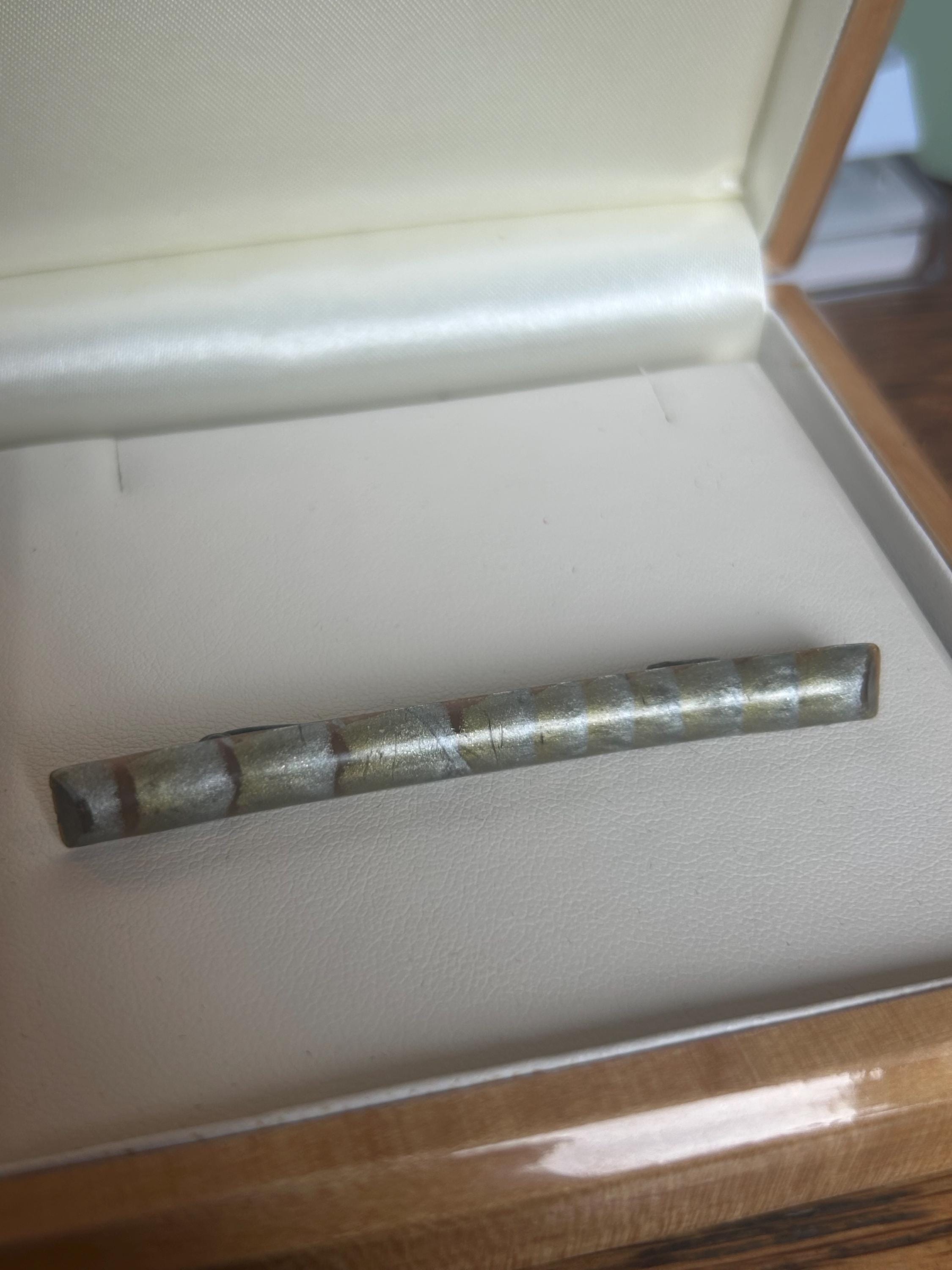 This slim, elegant piece measures approximately 7cm in length and features a striking metallic striped / faux wood-grain effect, either painted or naturally formed within the Bakelite itself — a lovely example of the experimental finishes popular during the mid-century period.