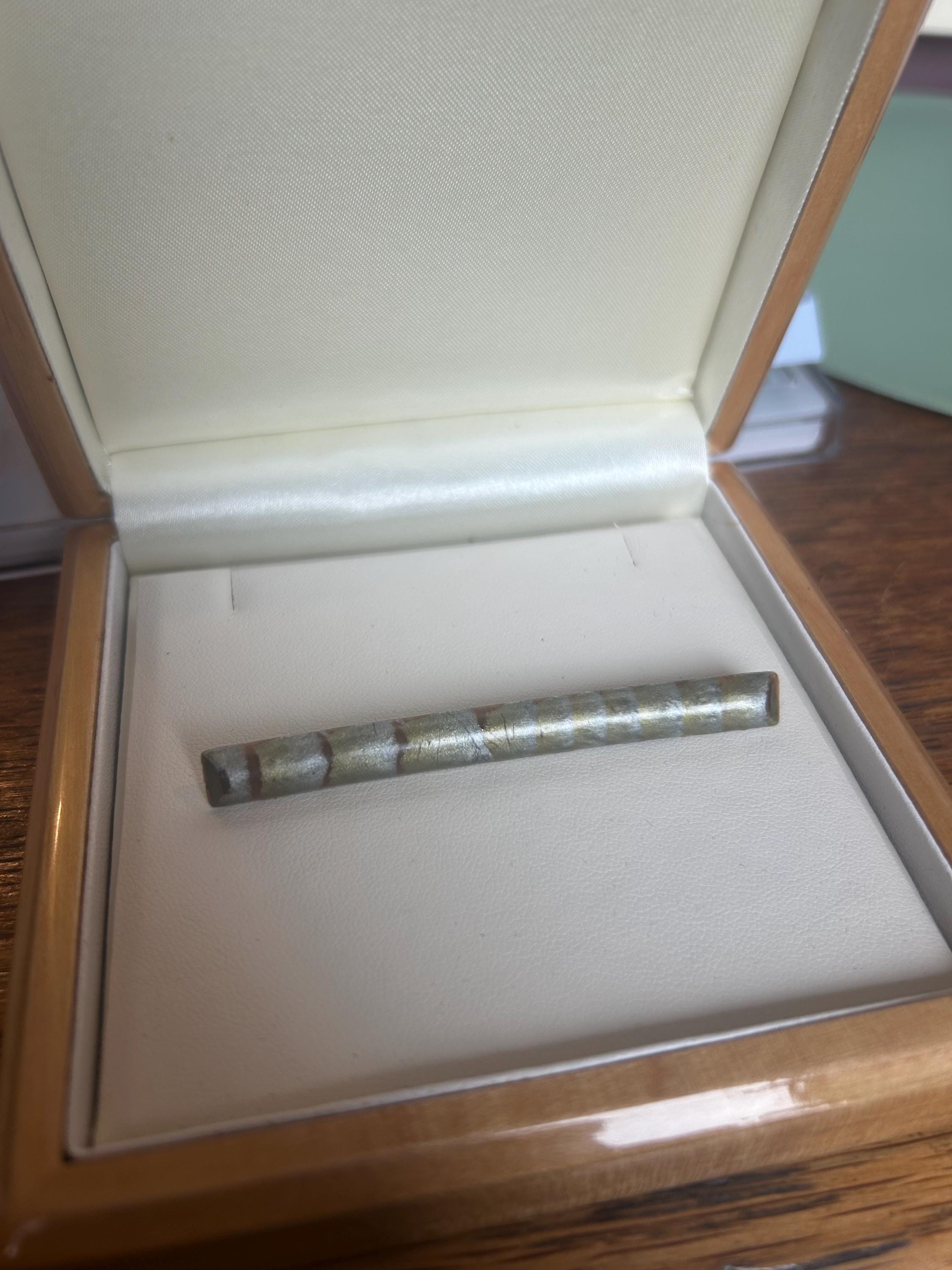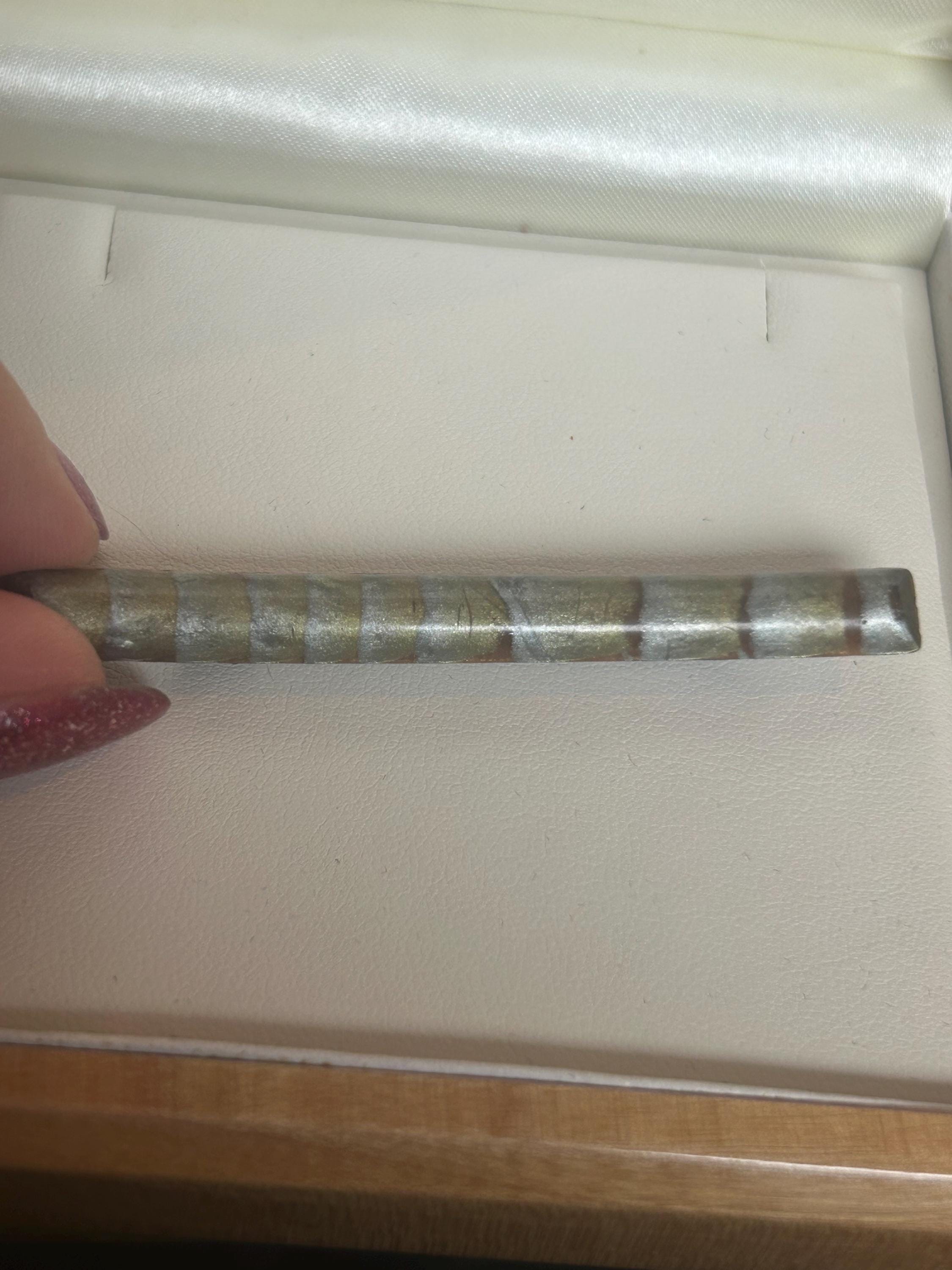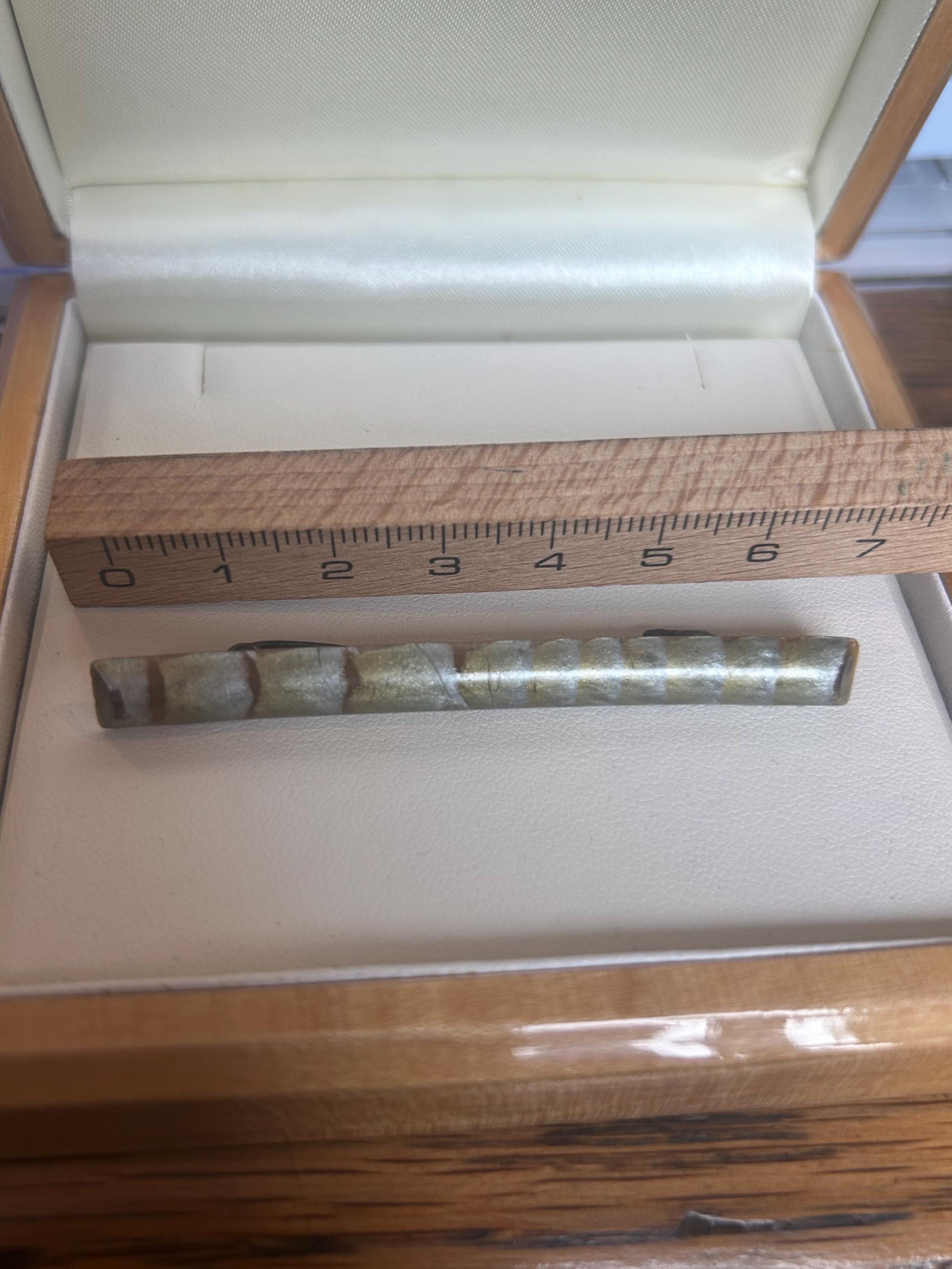 This slim, elegant piece measures approximately 7cm in length and features a striking metallic striped / faux wood-grain effect, either painted or naturally formed within the Bakelite itself — a lovely example of the experimental finishes popular during the mid-century period.